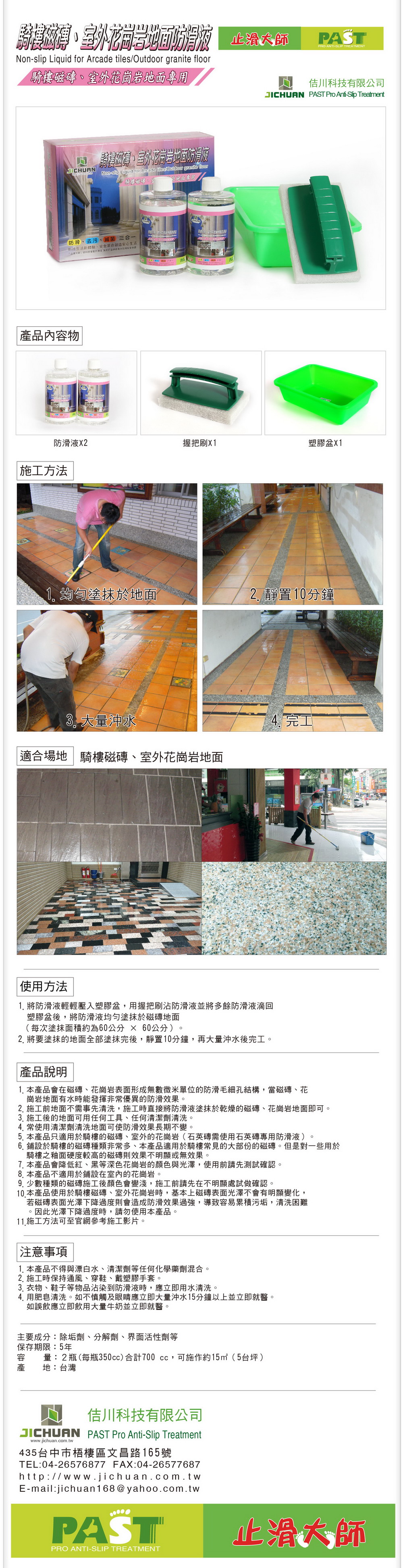 6.本產品只適用於騎樓的磁磚、室外的花崗岩。當使用本防滑劑後,無防滑效果之磁磚即為石英磚,石英磚需使用石英磚專用防滑液。